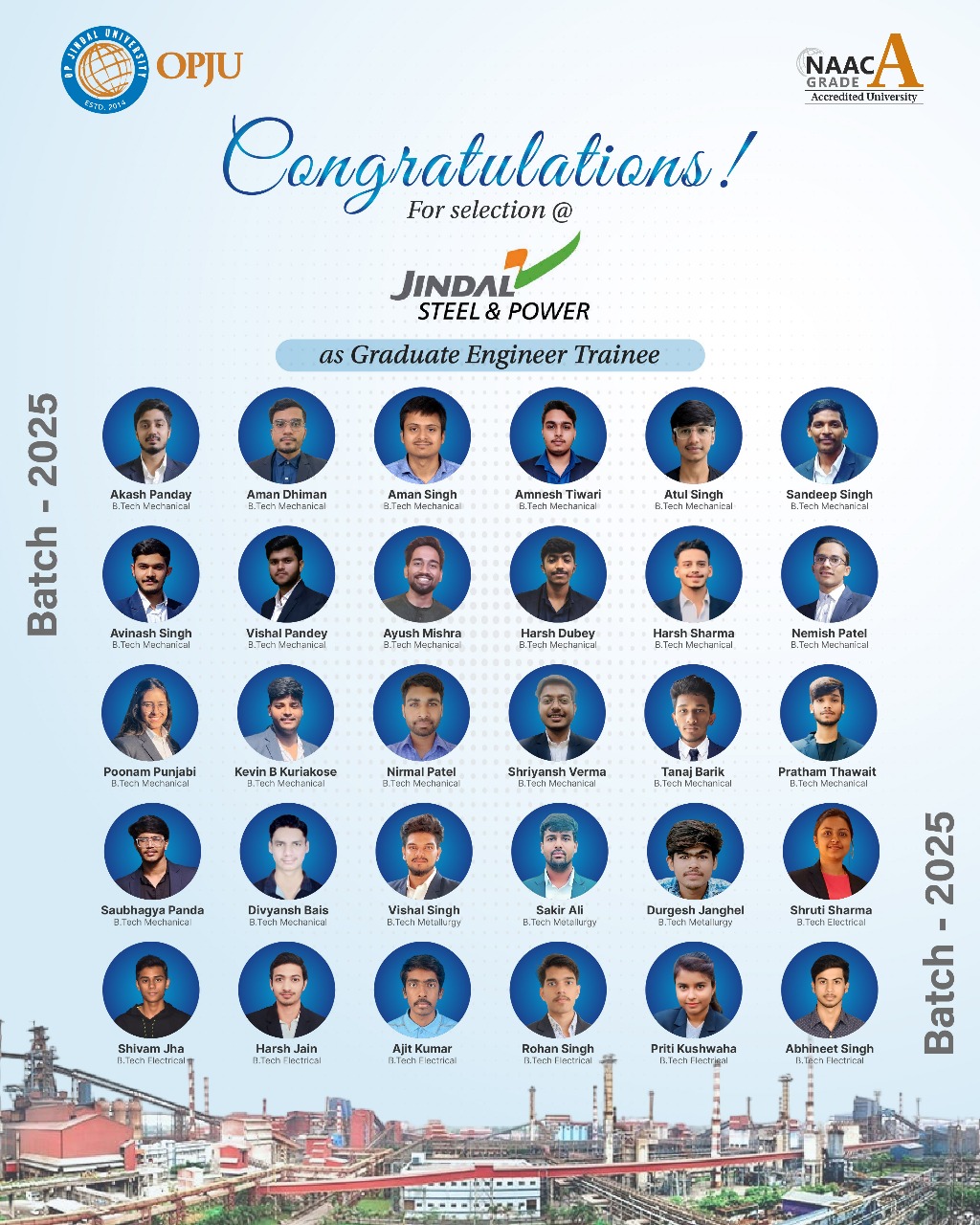 ओपीजेयू के मैकेनिकल, इलेक्ट्रिकल और मेटालर्जिकल ब्रांच के 30 छात्र जिंदल स्टील एंड पावर में ग्रेजुएट इंजीनियर ट्रेनी के रूप में चयनित