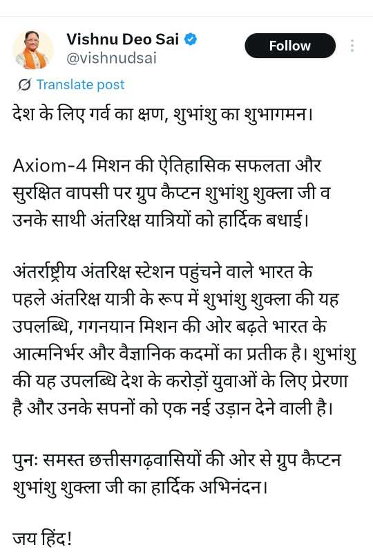 मुख्यमंत्री श्री साय ने इस अवसर पर सोशल मीडिया एक्स पर पोस्ट करते हुए कहा कि अंतर्राष्ट्रीय अंतरिक्ष स्टेशन पहुंचने वाले भारत के पहले अंतरिक्ष यात्री के रूप में शुभांशु शुक्ला की यह उपलब्धि, गगनयान मिशन की ओर बढ़ते भारत के आत्मनिर्भर और वैज्ञानिक कदमों का प्रतीक है। शुभांशु की यह उपलब्धि देश के करोड़ों युवाओं के लिए प्रेरणा है और उनके सपनों को एक नई उड़ान देने वाली है।
