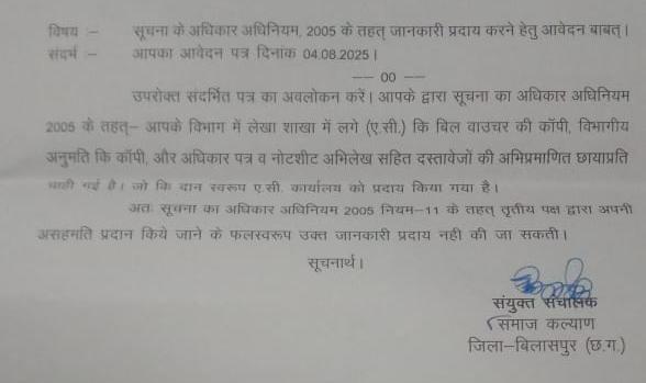 बिलासपुर = बिलासपुर जिले के समाज कल्याण विभाग में लेखा शाखा में दान के पैसे से ऐसी लगाया गया है, जो कि सूचना के अधिकार के तहत जानकारी प्राप्त हुई है, बताते चले कि सहायक ग्रेड 3 कर्मचारी के कमरे में ए सी का प्रावधान नहीं है।