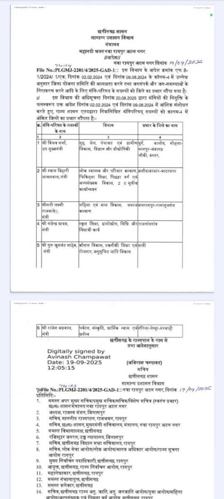 छत्तीसगढ़ में मंत्रिमंडल विस्तार के बाद साय सरकार ने मंत्रियों के जिले के प्रभार में बदलाव किया है. इसका आदेश आज सामान्य प्रशासन विभाग ने जारी किया है. आदेश के मुताबिक डिप्टी सीएम एवं गृह मंत्री विजय शर्मा को दुर्ग, बालोद, मोहला-मानपुर-अंबागढ़ चौकी और बस्तर जिले का प्रभार सौंपा गया है.