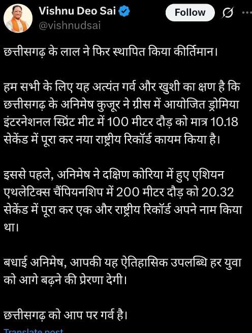 मुख्यमंत्री श्री साय ने कहा कि हम सभी के लिए यह अत्यंत गर्व और खुशी का क्षण है कि छत्तीसगढ़ के अनिमेष कुजूर ने ग्रीस में आयोजित ड्रोमिया इंटरनेशनल स्प्रिंट मीट में 100 मीटर दौड़ को मात्र 10.18 सेकेंड में पूरा कर नया राष्ट्रीय रिकॉर्ड कायम किया है।