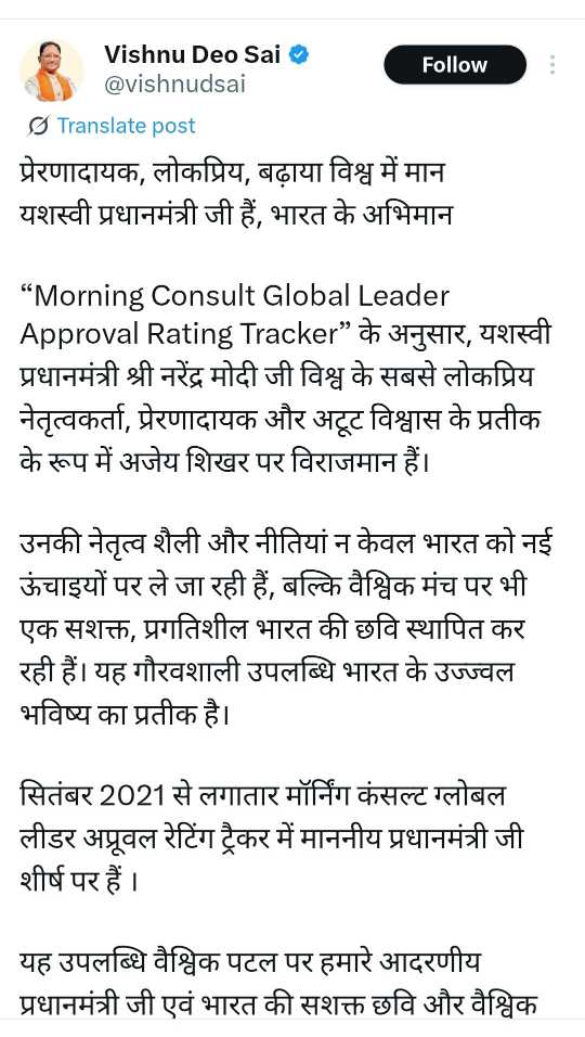 मुख्यमंत्री श्री साय ने कहा कि प्रधानमंत्री श्री मोदी सितंबर 2021 से लगातार इस रेटिंग में शीर्ष स्थान पर बने हुए हैं। यह उनकी अडिग नेतृत्व शैली, दूरदर्शी नीतियों और राष्ट्रहित में लिए गए ऐतिहासिक निर्णयों का प्रमाण है, जो न केवल भारत को नई ऊँचाइयों तक ले जा रही हैं, बल्कि विश्व समुदाय में भी भारत की सशक्त, प्रगतिशील और आत्मनिर्भर छवि को स्थापित कर रही हैं।