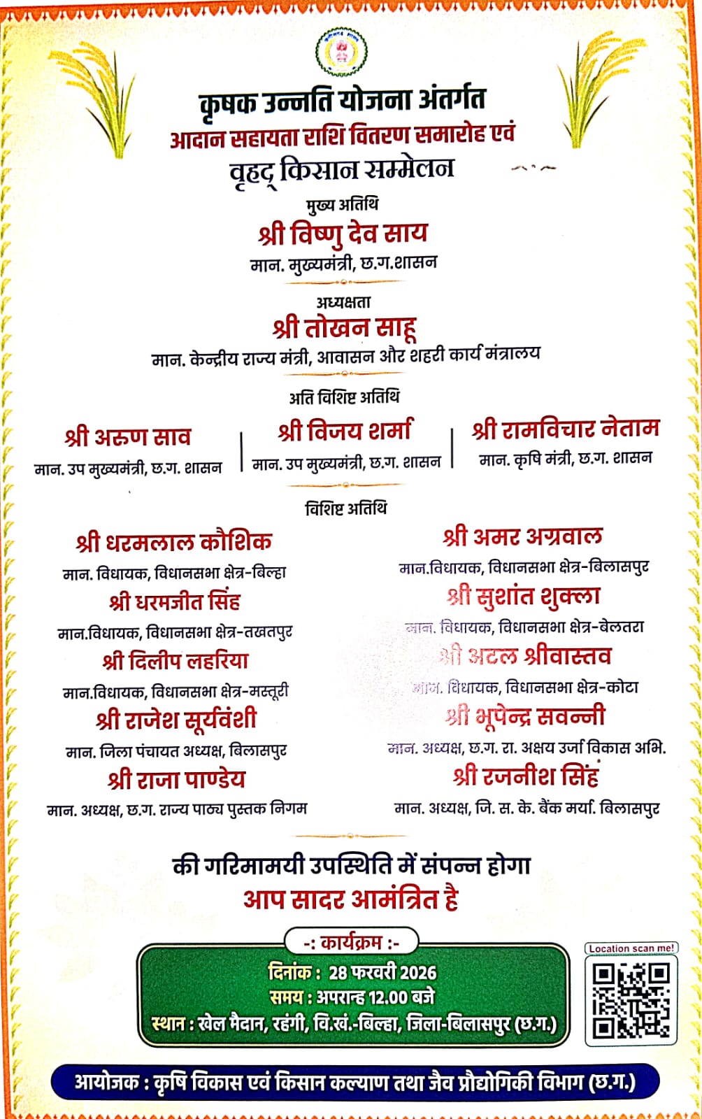 रायपुर, 27 फरवरी 2026/ छत्तीसगढ़ सरकार अपने संकल्प के अनुरूप होली पर्व से पूर्व 28 फरवरी को राज्य के अन्नदाताओं को 10 हजार 324 करोड़ रूपए की आदान सहायता उनके बैंक खातों में अंतरित करेगी। मुख्यमंत्री श्री विष्णु देव साय बिलासपुर जिले के बिल्हा विकासखण्ड स्थित रहंगी खेल मैदान में आयोजित वृहद किसान सम्मेलन में कृषक उन्नति योजना के तहत राज्य के 25 लाख 28 हजार किसानों को यह राशि जारी करेंगे। इस अवसर पर आयोजित कार्यक्रम की अध्यक्षता केन्द्रीय राज्य मंत्री श्री तोखन साहू करेंगे। कार्यक्रम में उपमुख्यमंत्री श्री अरूण साव एवं श्री विजय शर्मा, कृषि मंत्री श्री रामविचार नेताम विशिष्ट अतिथि के रूप में मौजूद रहेंगे।