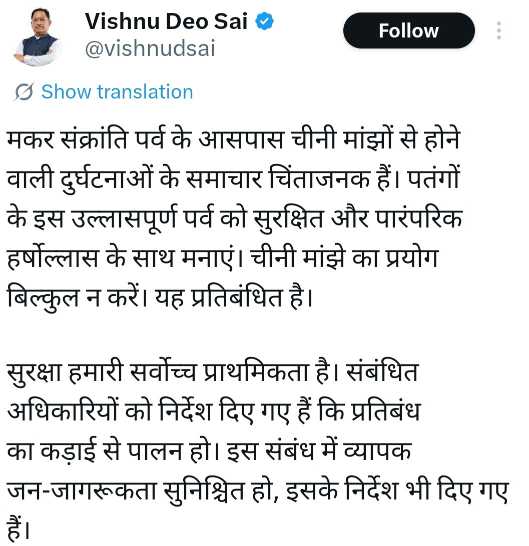 मुख्यमंत्री श्री साय ने स्पष्ट किया कि चीनी मांझा प्रतिबंधित है और इसका उपयोग न केवल कानूनन अपराध है, बल्कि यह आमजन, पक्षियों और राहगीरों के लिए भी गंभीर खतरा बनता है। उन्होंने कहा कि सुरक्षा सरकार की सर्वोच्च प्राथमिकता है और इस संबंध में संबंधित अधिकारियों को निर्देश दिए गए हैं कि प्रतिबंध का कड़ाई से पालन कराया जाए।