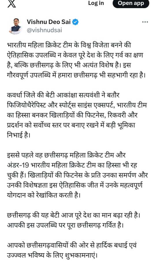 मुख्यमंत्री ने कहा — “यह जीत नारी शक्ति, परिश्रम और आत्मविश्वास की जीत है। हमें गर्व है कि इस गौरवमयी पल में छत्तीसगढ़ की बेटी ने भी अपना महत्वपूर्ण योगदान दिया है।”