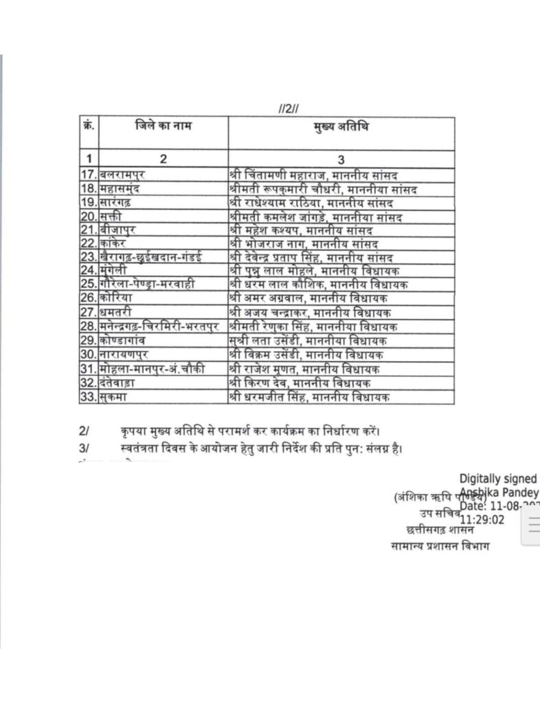 मुंगेली जिला मुख्यालय में विधायक श्री पुन्नूलाल मोहले, गौरेला-पेंड्रा-मरवाही में विधायक श्री धरमलाल कौशिक, कोरिया में विधायक श्री अमर अग्रवाल, धमतरी में विधायक श्री अजय चंद्राकर, मनेंद्रगढ़-चिरमिरी-भरतपुर में विधायक श्रीमती रेणुका सिंह, कोंडागांव में विधायक सुश्री लता उसेंडी, नारायणपुर में विधायक श्री विक्रम उसेंडी, मोहला-मानपुर-अंबागढ़ चौकी में विधायक श्री राजेश मूणत, दंतेवाड़ा में विधायक श्री किरण देव और सुकमा जिला मुख्यालय में विधायक श्री धरमजीत सिंह स्वतंत्रता दिवस समारोह में ध्वजारोहण करेंगे।