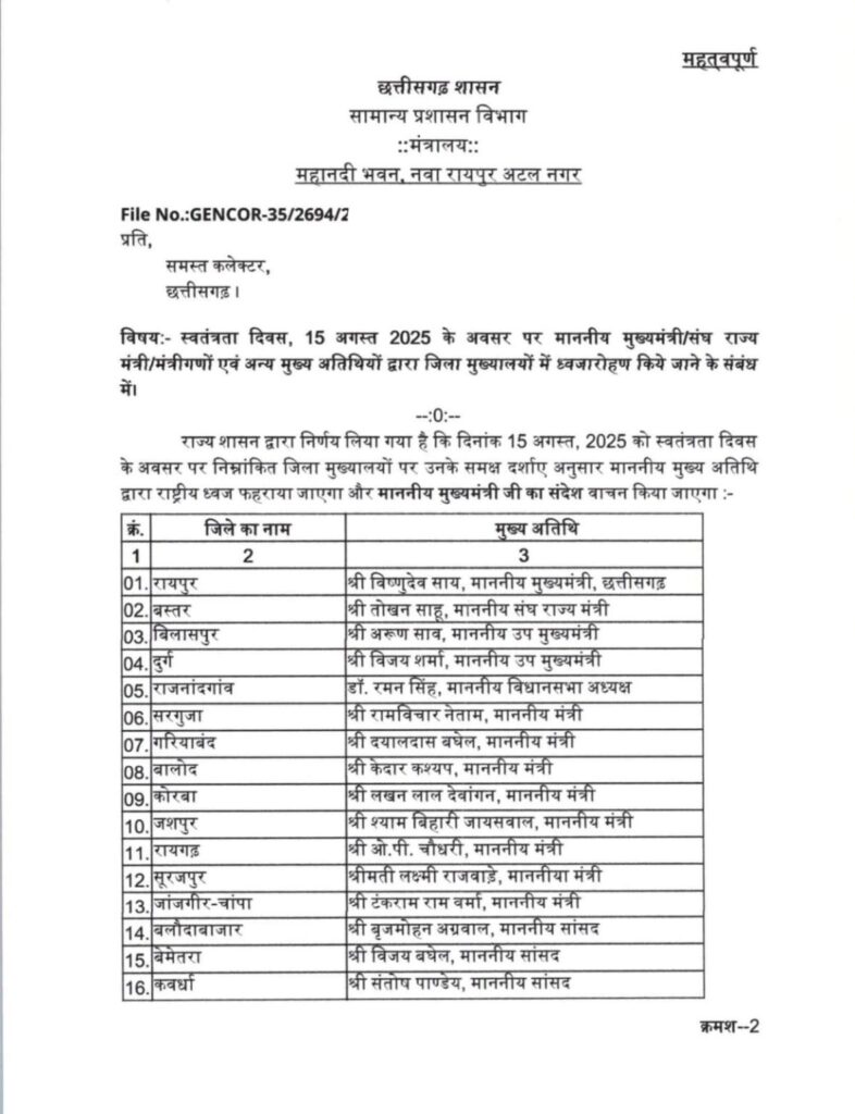 सामान्य प्रशासन विभाग से प्राप्त जानकारी के अनुसार, राजनांदगांव में विधानसभा अध्यक्ष डॉ. रमन सिंह, सरगुजा में आदिम जाति विकास मंत्री श्री रामविचार नेताम, गरियाबंद में खाद्य मंत्री श्री दयालदास बघेल, बालोद में वन मंत्री श्री केदार कश्यप, कोरबा में उद्योग मंत्री श्री लखन लाल देवांगन, जशपुर में स्वास्थ्य मंत्री श्री श्याम बिहारी जायसवाल, रायगढ़ में वित्त मंत्री श्री ओ.पी. चौधरी, सूरजपुर में महिला एवं बाल विकास मंत्री श्रीमती लक्ष्मी राजवाड़े, जांजगीर-चांपा में राजस्व मंत्री श्री टंकराम वर्मा, बलौदाबाजार में सांसद श्री बृजमोहन अग्रवाल, बेमेतरा में सांसद श्री विजय बघेल, कवर्धा में सांसद श्री संतोष पांडेय, बलरामपुर में सांसद श्री चिंतामणि महाराज, महासमुंद में सांसद श्रीमती रूपकुमारी चौधरी, सारंगढ़ में सांसद श्री राधेश्याम राठिया, सक्ती में सांसद श्रीमती कमलेश जांगड़े, बीजापुर में सांसद श्री महेश कश्यप, कांकेर में सांसद श्री भोजराज नाग, तथा खैरागढ़-छुईखदान-गंडई में सांसद श्री देवेंद्र प्रताप सिंह ध्वजारोहण करेंगे।