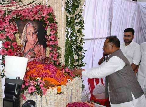 रायपुर/ मुख्यमंत्री श्री विष्णु देव साय ने आज भाटापारा के पूर्व विधायक श्री शिवरतन शर्मा की भाभी स्व. श्रीमती बिमला देवी शर्मा की श्रद्धांजलि सभा में शामिल हुए। भाटापारा स्थित अग्रसेन भवन में आयोजित श्रद्धांजलि सभा में मुख्यमंत्री श्री साय ने दिवंगत श्रीमती बिमला देवी शर्मा के छायाचित्र पर श्रद्धासुमन अर्पित कर श्रद्धांजलि दी और शोक संतप्त परिवार को ढांढस बंधाया।