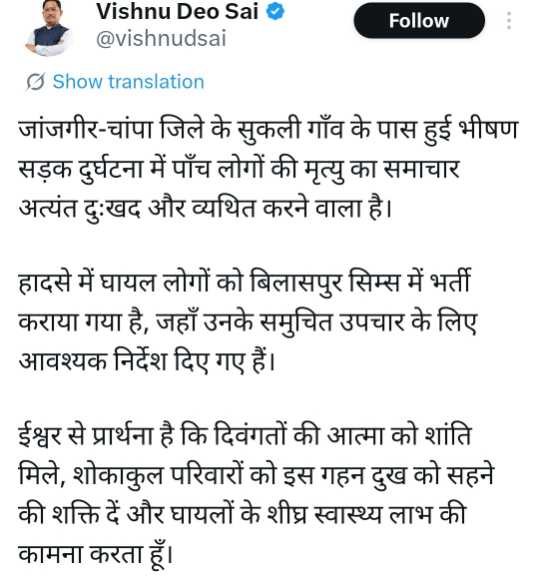 मुख्यमंत्री श्री साय ने इस हृदयविदारक दुर्घटना को अत्यंत दुःखद बताते हुए पीड़ित परिवारों के प्रति अपनी संवेदनाएँ प्रकट की हैं।