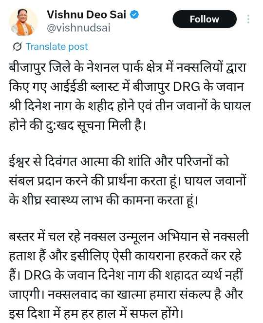 मुख्यमंत्री विष्णुदेव साय ने बीजापुर जिले के नेशनल पार्क क्षेत्र में नक्सलियों द्वारा किए गए आईईडी ब्लास्ट की घटना पर गहरा शोक व्यक्त किया है। मुख्यमंत्री श्री साय ने कहा कि इस घटना में जिला रिजर्व गार्ड (DRG) के जवान श्री दिनेश नाग के शहीद होने तथा तीन जवानों के घायल होने की सूचना मिली है।