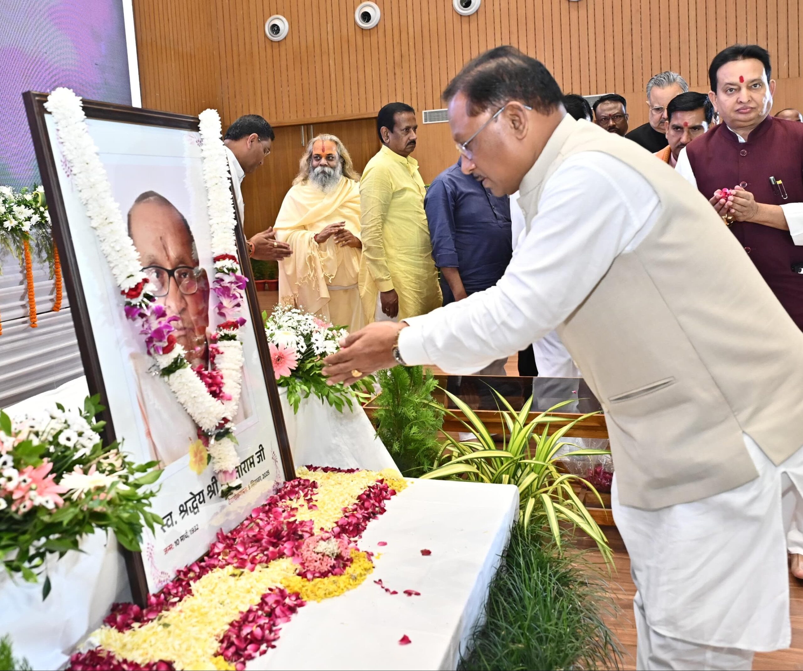 रायपुर/ मुख्यमंत्री श्री विष्णुदेव साय आज राजधानी रायपुर स्थित इंदिरा गांधी कृषि विश्वविद्यालय के सभागार में आयोजित शांता राम सर्राफ जी की श्रद्धांजलि सभा में सम्मिलित हुए। मुख्यमंत्री श्री साय ने शांता राम सर्राफ जी के छायाचित्र पर पुष्पांजलि अर्पित कर उन्हें श्रद्धांजलि दी। उन्होंने ईश्वर से प्रार्थना की कि दिवंगत आत्मा को अपने श्रीचरणों में स्थान दें तथा शोकाकुल परिजनों को दुःख को सहन करने की शक्ति प्रदान करे।