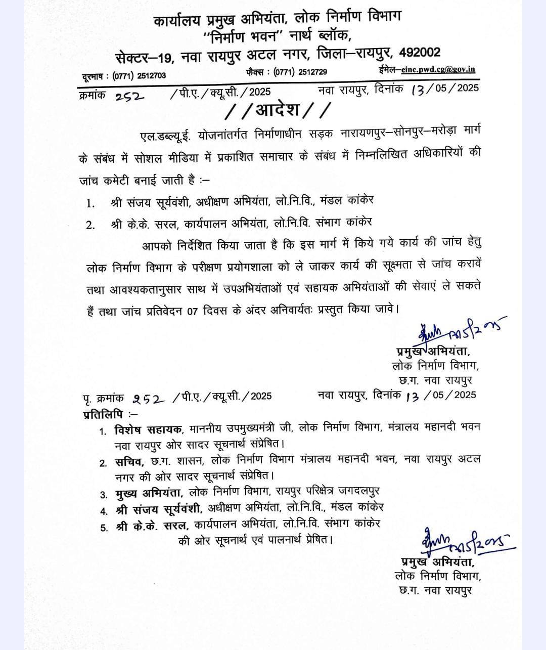 उप मुख्यमंत्री के निर्देश के बाद लोक निर्माण विभाग के प्रमुख अभियंता ने कांकेर मंडल के अधीक्षण अभियंता श्री संजय सूर्यवंशी और कार्यपालन अभियंता श्री के.के. सरल की दो सदस्यीय कमेटी बनाकर जांच करने के आदेश दिए हैं। उन्होंने नारायणपुर-सोनपुर-मरोड़ा मार्ग में किये गये कार्य की जांच के लिए लोक निर्माण विभाग के परीक्षण प्रयोगशाला को ले जाकर कार्य की सूक्ष्मता से जांच करने को कहा है।