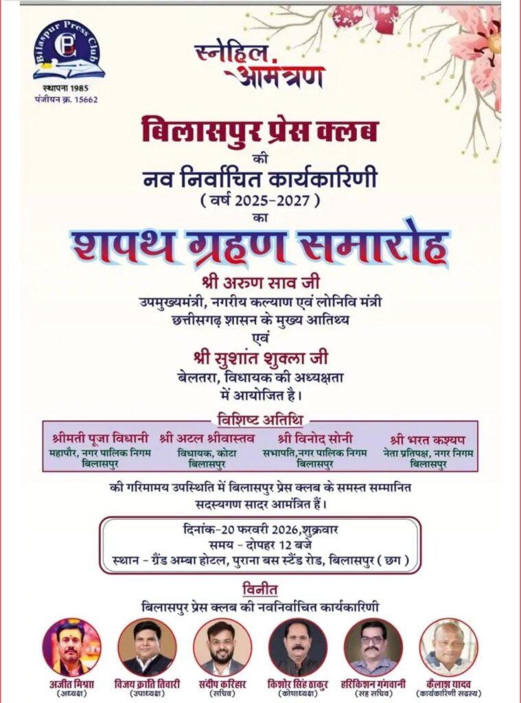 बिलासपुर।बिलासपुर प्रेस क्लब की नव निर्वाचित कार्यकारिणी (2025-2027) का शपथ ग्रहण समारोह शुक्रवार को दोपहर 12 बजे ग्रैंड अम्बा होटल, पुराना बस स्टैंड रोड में आयोजित किया जाएगा। इस अवसर पर छत्तीसगढ़ शासन के उपमुख्यमंत्री एवं नगरीय प्रशासन तथा लोक निर्माण मंत्री अरुण साव स्वयं नई कार्यकारिणी को शपथ दिलाएंगे।