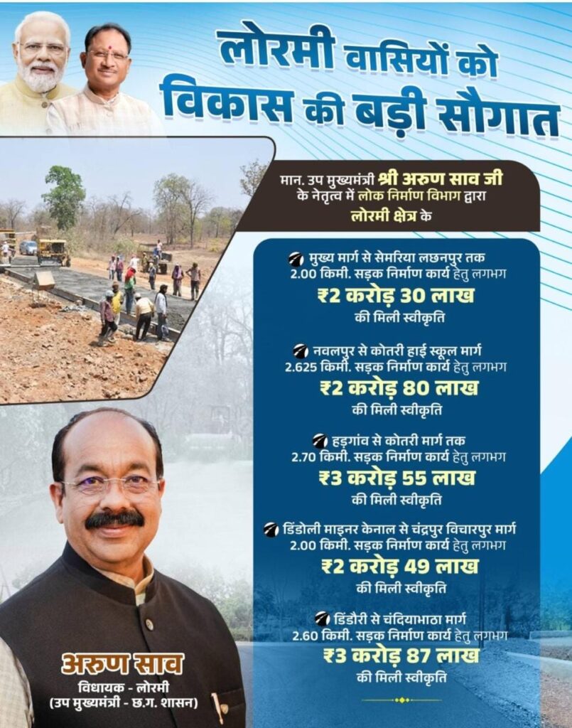 लोरमी में विकास को रफ्तार: डिप्टी सीएम अरुण साव ने 05 सड़कों के लिए दी 15.59 करोड़ की स्वीकृति