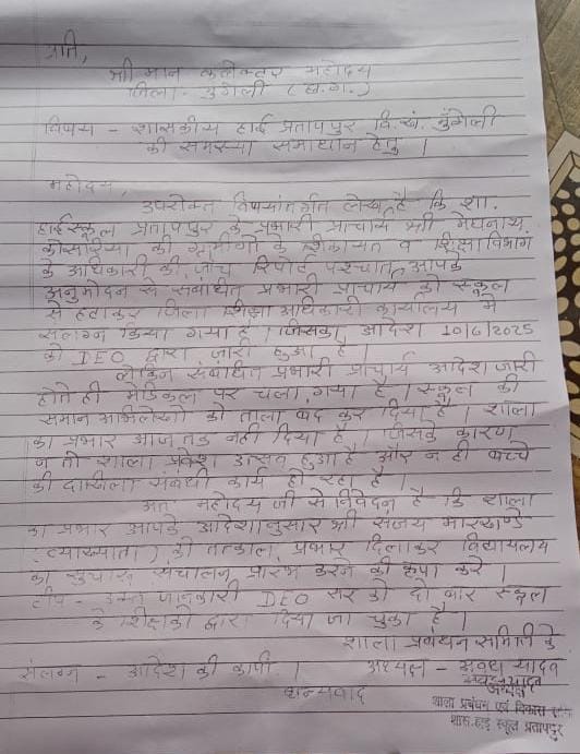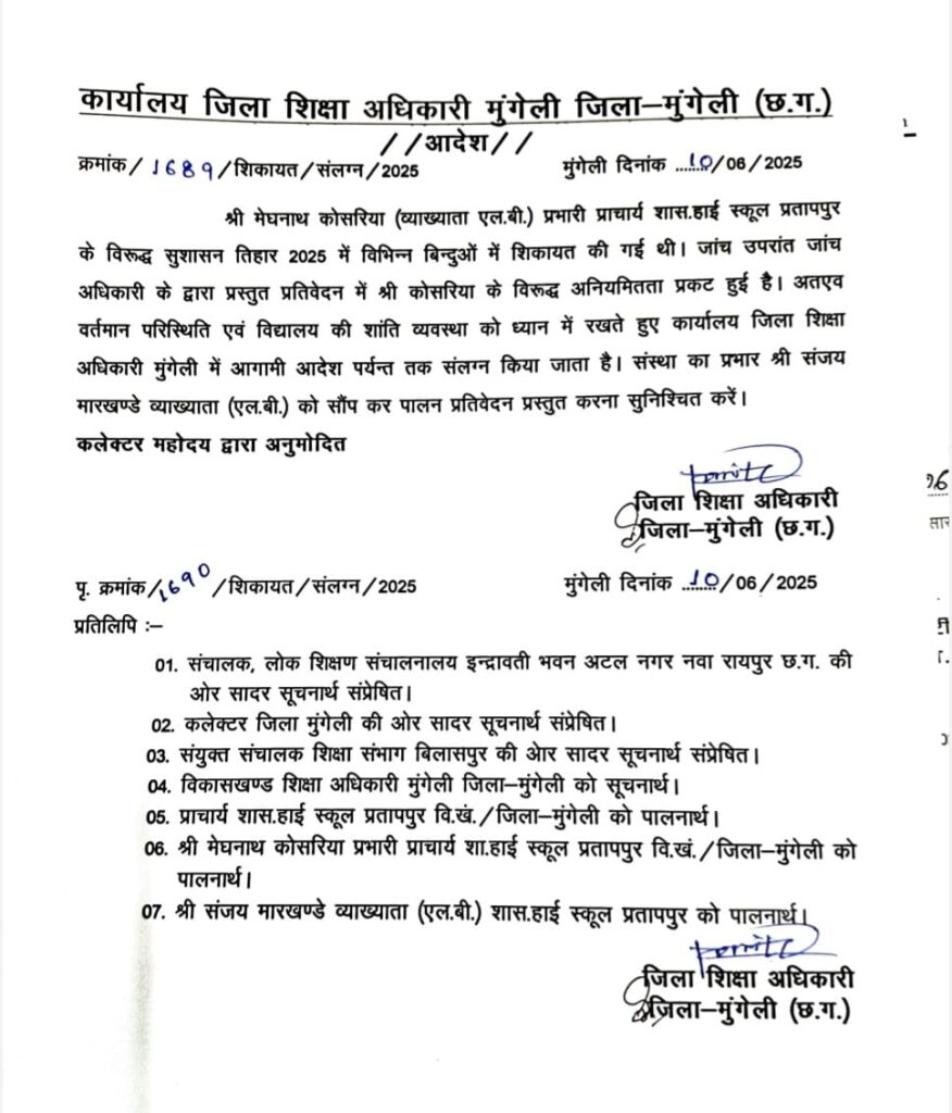 मालूम हो मेघनाथ कोसरिया (व्याख्याता एल.बी.) प्रभारी प्राचार्य शास.हाई स्कूल प्रतापपुर के विरूद्ध सुशासन तिहार 2026 नें विभिन्न बिन्दुओं कें शिकायत की गई थी। जिसकी जांच उपरांत जांच द्वारा प्रस्तुत प्रतिवेदन मेघनाथ कोसरिया के विरूद्ध अनियमितता पाई गई।
