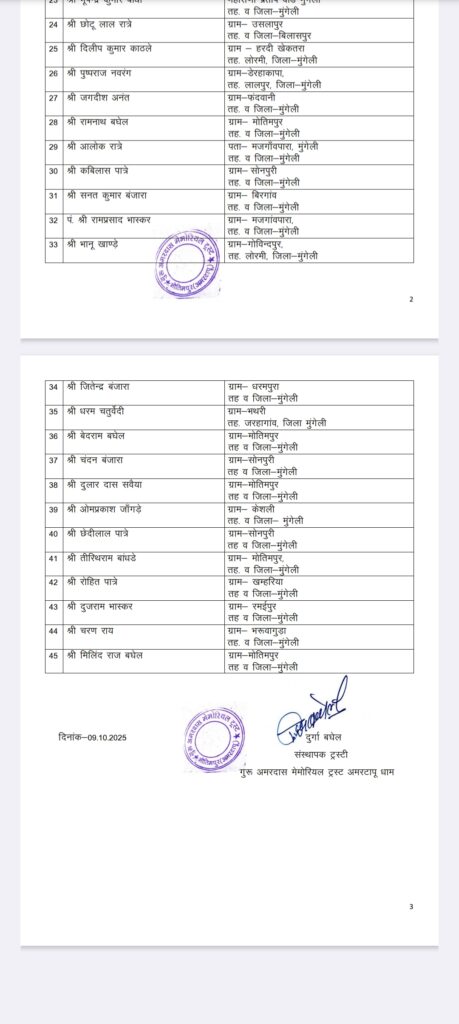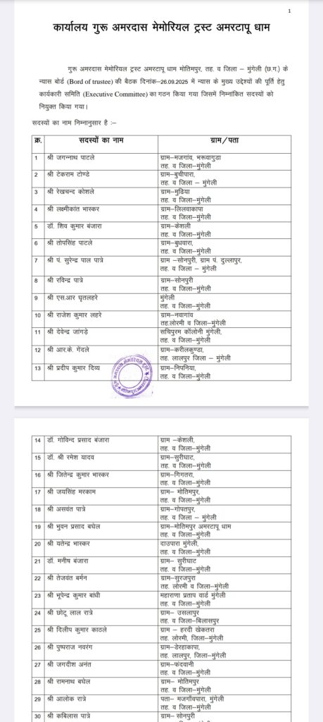 मुंगेली। गुरु अमरदास मेमोरियल ट्रस्ट, अमरटापू धाम (मोतिमपुर, मुंगेली) के न्यास बोर्ड की बैठक हाल ही में संपन्न हुई। बैठक में ट्रस्ट के उद्देश्यों की पूर्ति एवं व्यवस्थाओं के सुचारु संचालन हेतु कार्यकारी समिति का गठन किया गया।