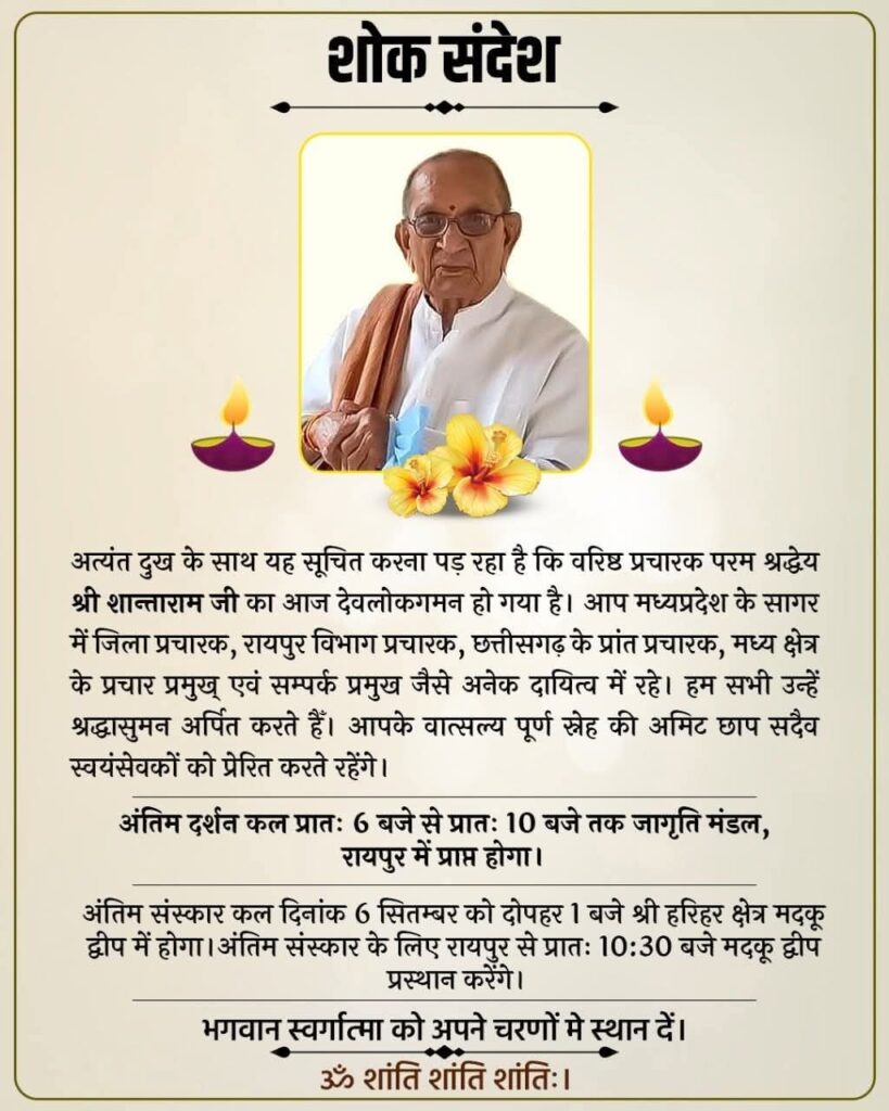 नहीं रहे RSS के पूर्व प्रांत प्रचारक, वरिष्ठ स्वयं सेवक शांताराम सर्राफ…CM विष्णुदेव साय ने जताया शोक,कल मदकू में होगा अंतिम संस्कार