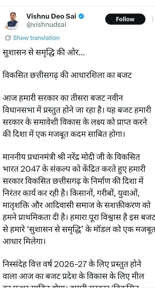 रायपुर 24 फरवरी 2026/ मुख्यमंत्री श्री विष्णु देव साय ने वित्त वर्ष 2026-27 के लिए प्रस्तुत किए जा रहे राज्य के बजट को प्रदेश के समग्र विकास की दिशा में महत्वपूर्ण कदम बताते हुए प्रदेशवासियों को शुभकामनाएं दी हैं। उन्होंने कहा कि नवीन विधानसभा भवन में प्रस्तुत होने जा रहा यह तीसरा बजट विकसित और समृद्ध छत्तीसगढ़ के निर्माण के लिए सरकार के विज़न को नई मजबूती प्रदान करेगा।
