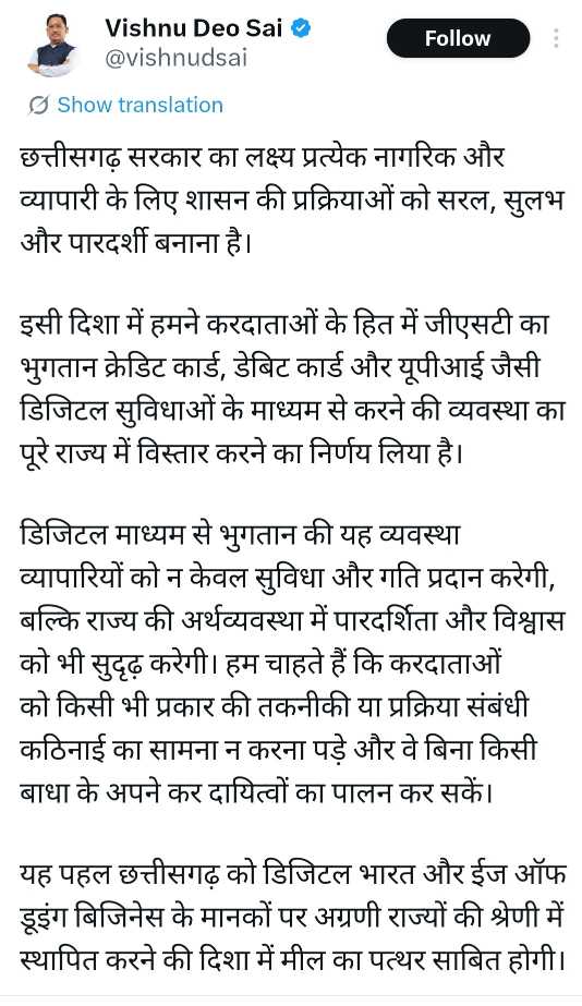 “छत्तीसगढ़ सरकार का लक्ष्य प्रत्येक नागरिक और व्यापारी के लिए शासन की प्रक्रियाओं को सरल, सुलभ और पारदर्शी बनाना है। करदाताओं के हित में जीएसटी भुगतान के लिए क्रेडिट कार्ड, डेबिट कार्ड और यूपीआई जैसी डिजिटल सुविधाओं का राज्यभर में विस्तार इसी दिशा में एक महत्वपूर्ण कदम है। डिजिटल माध्यम से भुगतान की यह व्यवस्था व्यापारियों को न केवल सुविधा और गति प्रदान करेगी, बल्कि राज्य की अर्थव्यवस्था में पारदर्शिता और विश्वास को भी सुदृढ़ करेगी। हम चाहते हैं कि करदाताओं को किसी भी प्रकार की तकनीकी या प्रक्रिया संबंधी कठिनाई का सामना न करना पड़े, और वे बिना किसी बाधा के अपने कर दायित्वों का पालन कर सकें। यह पहल छत्तीसगढ़ को डिजिटल भारत और ईज ऑफ डूइंग बिजिनेस के मानकों पर अग्रणी राज्यों की श्रेणी में स्थापित करने की दिशा में मील का पत्थर साबित होगी।” – मुख्यमंत्री श्री विष्णु देव साय