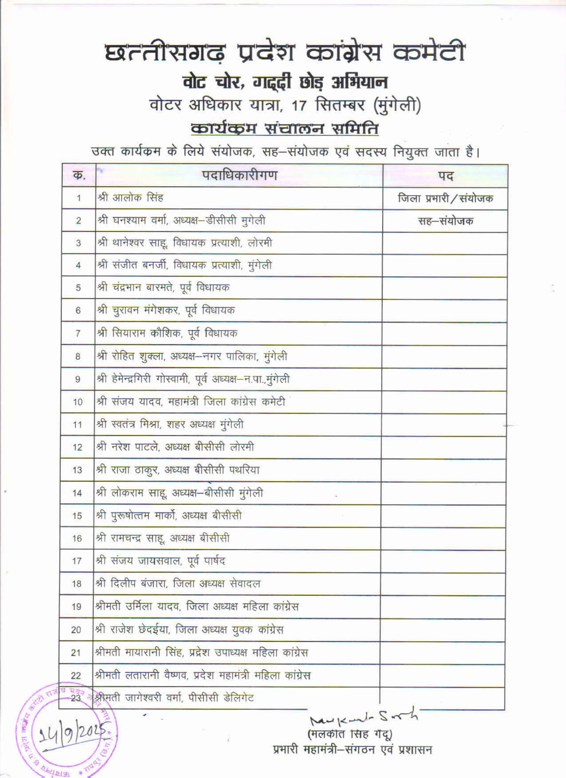 रायपुर/मुंगेली। छत्तीसगढ़ में कांग्रेस पार्टी एक बार फिर अपना खोया ताज पाने की तैयारी शुरू कर दी है। कांग्रेस के राष्ट्रव्यापी मुहिम ‘वोट चोर–गद्दी छोड़‘ कार्यक्रम अंतर्गत प्रदेश प्रभारी सचिन पायलट की उपस्थिति में आगामी 17 सितंबर मुंगेली में बड़ी सभा का आयोजन है मगर इस सभा के पहले ही ब्लॉक स्तर की बैठकों में सीनियर/प्रभारी नेताओं के समक्ष जमीनी स्तर के कार्यकर्ताओं एवं पदाधिकारियों द्वारा जिला कांग्रेस अध्यक्ष घनश्याम वर्मा के विरुद्ध अपनी नाराजगी जाहिर कर इस्तीफे देने की बात रखी गई ये डिंडोरी व जरहागांव की बैठकों में हुआ।जिसमें सभी आक्रोशित लोगों ने गुटबाजी और आपसी झगड़ों पर खुलकर अपनी बात रखी। उसके ठीक बाद दी शाम बड़े सभा के लिए प्रदेश कांग्रेस कमेटी द्वारा मुंगेली जिले के आगामी वोट चोर गद्दी छोड़ कार्यक्रम के लिए संयोजक/प्रभारी अन्य जवाबदारियों के लिए नियुक्ति के बाद भयंकर आक्रोश देखने को मिल रहा है। इस नियुक्ति में चर्चा यह भी हो रही है कि वर्तमान में जो जिले में कर्ताधर्ता बनते रहे है या पदाधिकारी है उन्हीं के अनुसार सूची जिले स्तर पर ही बनाकर सिर्फ प्रदेश कांग्रेस कमेटी के लेटर हेड व प्रभारी महामंत्री का हस्ताक्षर ले लिया गया हो।