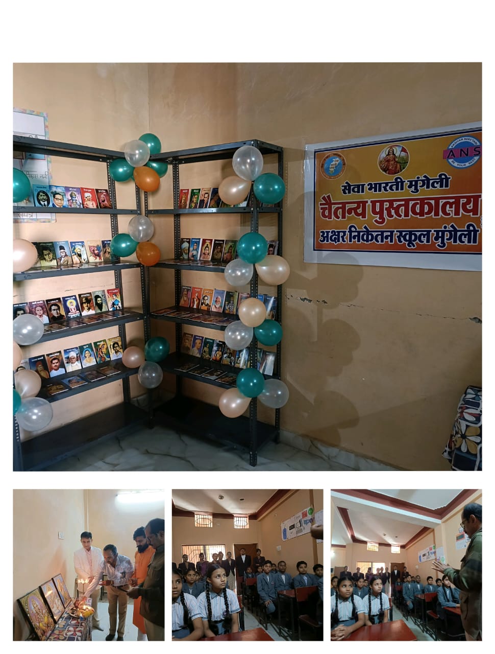 मुंगेली। अक्षर निकेतन स्कूल, मुंगेली में बच्चों के बौद्धिक विकास को बढ़ावा देने के उद्देश्य से चैतन्य पुस्तकालय का शुभारंभ सेवा भारती मुंगेली द्वारा किया गया। इस पुस्तकालय में भारत भारती की पुस्तकें, 100 महापुरुषों की जीवनियाँ तथा प्रेरक प्रसंगों से संबंधित साहित्य उपलब्ध कराया गया है।