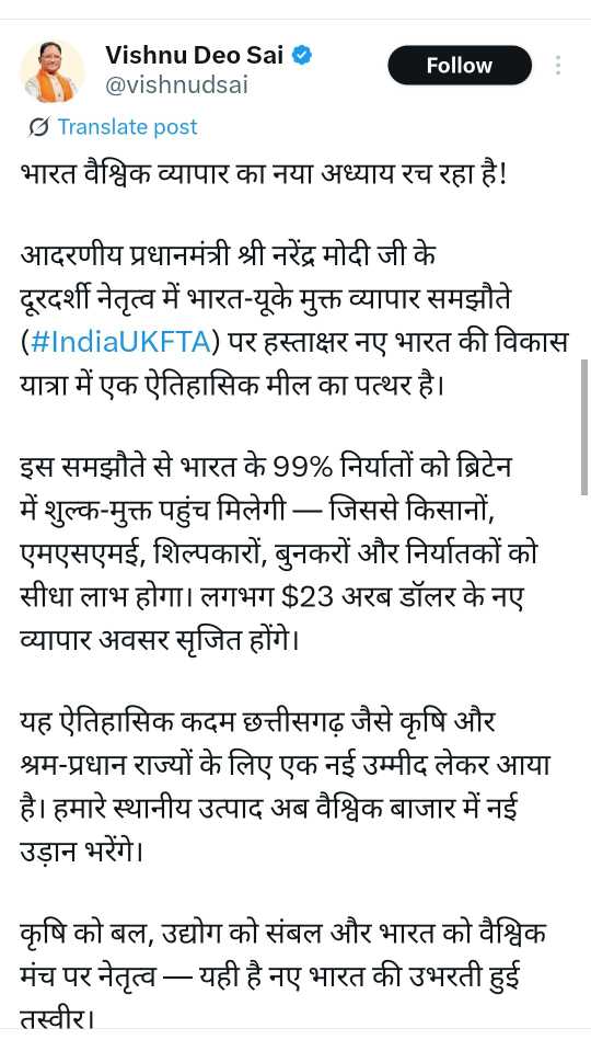 मुख्यमंत्री श्री साय ने कहा कि भारत-यूके एफटीए से भारत के 99% निर्यात उत्पादों को ब्रिटेन में शुल्क मुक्त पहुंच मिलेगी। इससे किसानों, एमएसएमई, हस्तशिल्पियों, बुनकरों और पारंपरिक उत्पादों को सीधे लाभ मिलेगा। इस समझौते से अनुमानित $23 अरब डॉलर के नए व्यापार अवसर खुलेंगे।