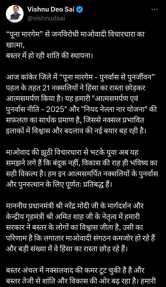 मुख्यमंत्री श्री साय ने कहा कि आज कांकेर जिले में 21 नक्सलियों ने हिंसा का रास्ता छोड़कर आत्मसमर्पण किया, जो प्रदेश में चल रही “आत्मसमर्पण एवं पुनर्वास नीति – 2025” तथा “नियद नेल्ला नार योजना” की सफलता का सशक्त प्रमाण है।