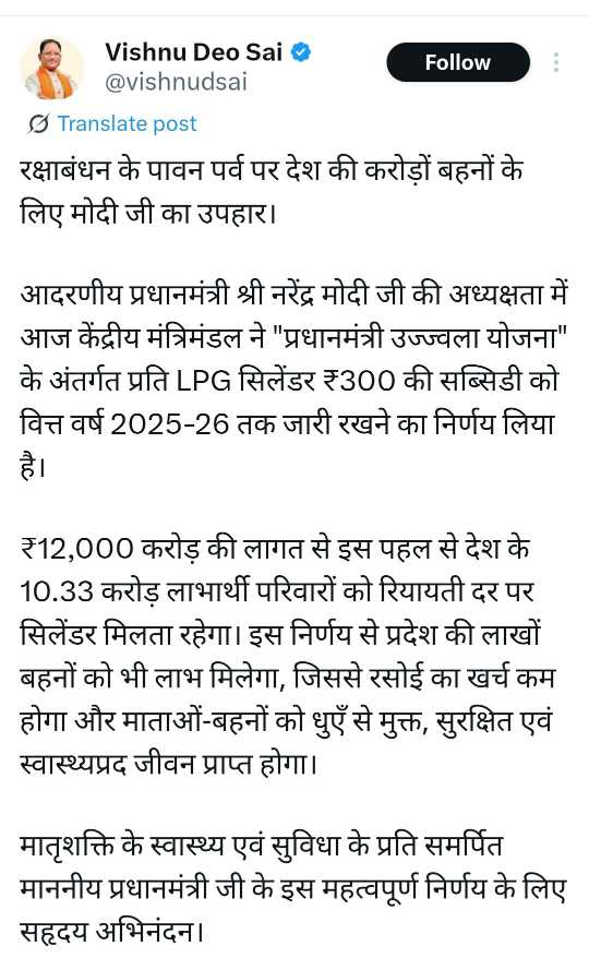 मुख्यमंत्री श्री साय ने कहा कि केंद्र सरकार द्वारा ₹12,000 करोड़ की लागत की इस पहल से 10.33 करोड़ उज्ज्वला लाभार्थी परिवारों को सीधे राहत देगा।