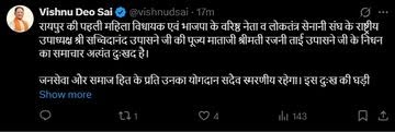 छत्तीसगढ़ की राजधानी रायपुर से दुखद खबर सामने आई है। रायपुर की पहली महिला विधायक रजनी ताई उपासने का 93 साल की उम्र में निधन हो गया। वे लंबे समय से अस्वस्थ चल रही थीं। उनके निधन से रायपुर ही नहीं, बल्कि पूरे छत्तीसगढ़ के राजनीतिक जगत में शोक की लहर है।