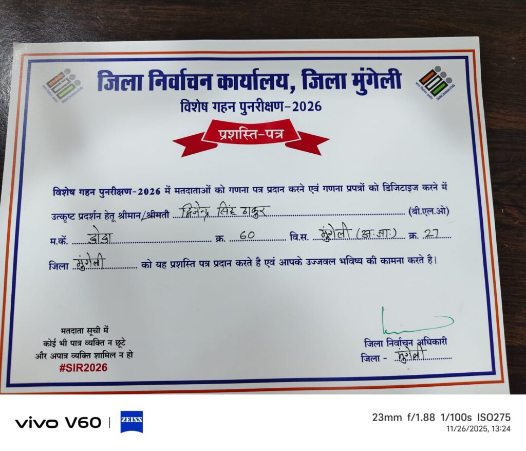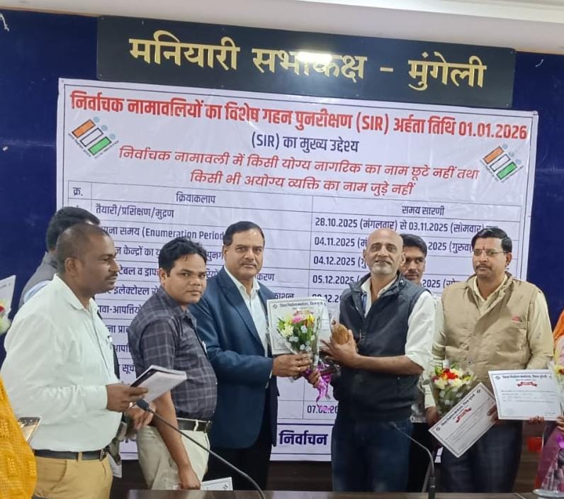 मुंगेली। मतदाता सूची के गहन पुनरीक्षण कार्य में उत्कृष्ट प्रदर्शन और शत-प्रतिशत डिजिटाईजेशन सुनिश्चित करने वाले बीएलओ द्विजेंद्र सिंह गहरवार को डिप्टी कलेक्टर मायानंद चंद्रा ने कलेक्ट्रेट कार्यालय में सम्मानित किया। इस दौरान डिप्टी कलेक्टर मायानंद चंद्रा ने बीएलओ द्विजेंद्र सिंह गहरवार को प्रशस्ति पत्र प्रदान कर उनके कार्य की सराहना की।