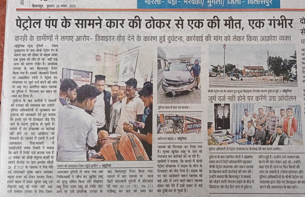 मुंगेली। मुंगेली–बिलासपुर मार्ग श्री पेट्रोल पंप के ठीक सामने अनैतिक रूप से डिवाइडर तोड़ देने के बाद दुपहिया वाहनों की आवाजाही से कुछ दिनों पूर्व एक युवक की मौत हो जाने के बाद कल यानी 9 जनवरी की शाम जिला प्रशासन की पूरी टीम ने स्वयं खड़े होकर देर रात तक पीडब्ल्यूडी के अधिकारियों, ठेकेदार से डिवाइडर बंद कर किसी आगामी घटना को रोकने काम किया गया मगर रात 1.30 बजे अचानक पेट्रोल पंप के संचालक और कर्मचारियों द्वारा बंद किए डिवाइडर को रातों रात तोड़ कर पुनः डिवाइडर ब्रेक कर मार्ग खोल दिया गया।