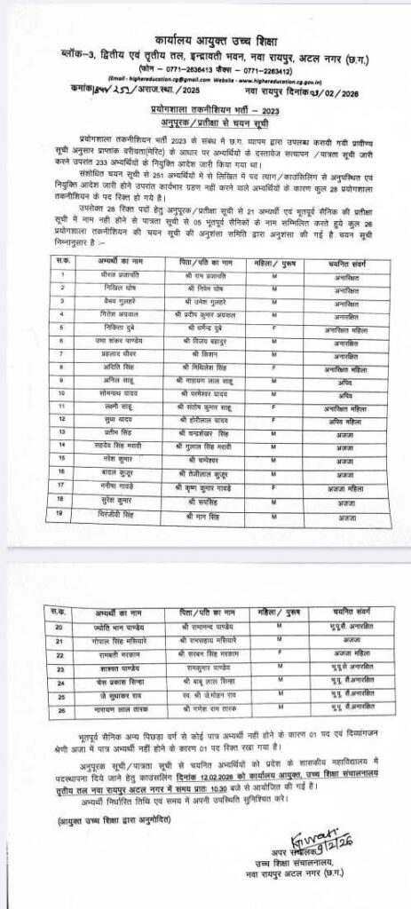 रायपुर : प्रयोगशाला तकनीशियन भर्ती-2023 के अंतर्गत चयन की प्रक्रिया पूरी करते हुए उच्च शिक्षा विभाग द्वारा 26 अभ्यर्थियों की अंतिम चयन सूची जारी कर दी गई है। यह सूची छत्तीसगढ़ व्यापम द्वारा आयोजित भर्ती परीक्षा एवं दस्तावेज सत्यापन के आधार पर तैयार की गई है।