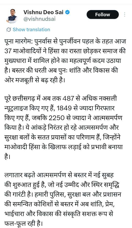 मुख्यमंत्री ने विश्वास व्यक्त किया कि बस्तर में जारी यह सकारात्मक परिवर्तन आगे भी जारी रहेगा और क्षेत्र स्थायी शांति, विकास, रोज़गार, शिक्षा एवं सामाजिक समरसता की नई पहचान बनाएगा।