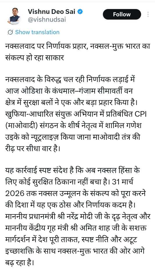 मुख्यमंत्री विष्णुदेव साय ने ओडिशा के कंधमाल-गंजाम सीमावर्ती वन क्षेत्रों में संचालित संयुक्त सुरक्षा अभियान में सीपीआई (माओवादी) संगठन के शीर्ष नेतृत्व में शामिल गणेश उइके के न्यूट्रलाइज किए जाने को नक्सलवाद के विरुद्ध चल रही निर्णायक लड़ाई में महत्वपूर्ण उपलब्धि बताया है।