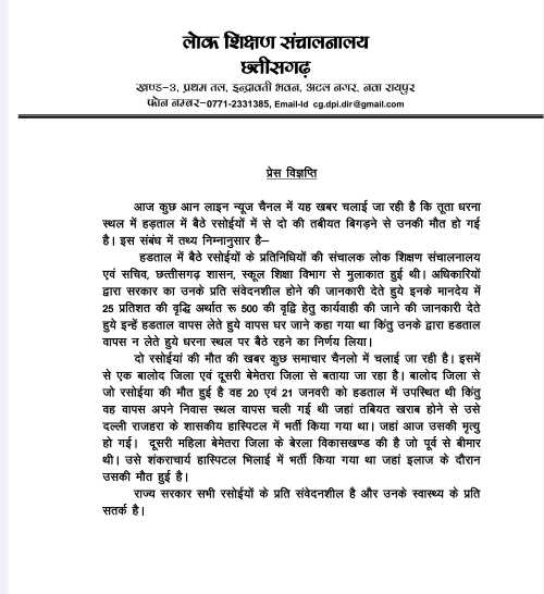 समाचार चैनलों में जिन दो रसोईयों की मृत्यु की खबर प्रसारित की जा रही है, उनमें से एक रसोईया बालोद जिले की निवासी थी, जो 20 एवं 21 जनवरी को धरना स्थल पर उपस्थित रही थी, किंतु बाद में अपने निवास स्थान लौट गई थी।