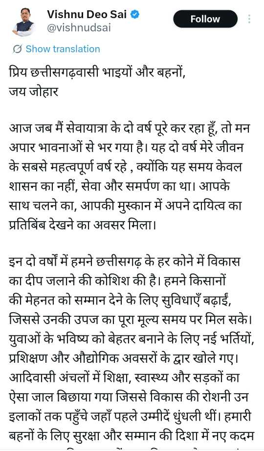 रायपुर 13 दिसंबर 2025/मुख्यमंत्री विष्णुदेव साय ने अपनी सेवायात्रा के दो वर्ष पूर्ण होने के अवसर पर छत्तीसगढ़ की जनता के प्रति कृतज्ञता व्यक्त करते हुए कहा है कि बीते दो वर्ष शासन के नहीं, बल्कि सेवा,j समर्पण और जनसहभागिता के वर्ष रहे हैं। उन्होंने कहा कि यह समय उनके जीवन के सबसे महत्वपूर्ण वर्षों में से एक रहा,m क्योंकि इस दौरान उन्हें प्रदेशवासियों के साथ कंधे से कंधा मिलाकर चलने और उनकी अपेक्षाओं को समझने का अवसर मिला।