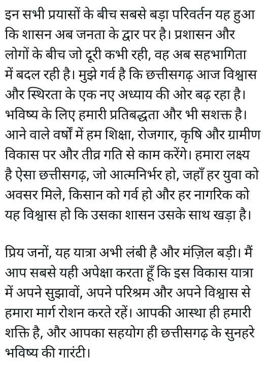 मुख्यमंत्री श्री साय ने कहा कि भविष्य के लिए सरकार की प्रतिबद्धता और भी सशक्त है। आने वाले वर्षों में शिक्षा, रोजगार, कृषि और ग्रामीण विकास के क्षेत्र में और तेज़ गति से कार्य किया जाएगा। उन्होंने कहा कि हमारा लक्ष्य आत्मनिर्भर और विकसित छत्तीसगढ़ का निर्माण करना है, जहाँ प्रत्येक युवा को अवसर, किसान को गर्व और हर नागरिक को यह विश्वास हो कि शासन सदैव उसके साथ खड़ा है।