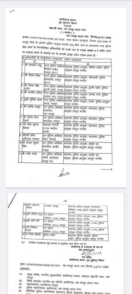 छत्तीसगढ़ शासन ने रायपुर जिले में 23 जनवरी 2026 से पुलिस आयुक्त प्रणाली लागू कर दी है। इसके तहत राज्य पुलिस सेवा के 16 अधिकारियों को नगर पुलिस अधीक्षक एवं उप पुलिस अधीक्षक पदों से सहायक पुलिस आयुक्त (ACP) के रूप में नई जिम्मेदारियां दी गई हैं।