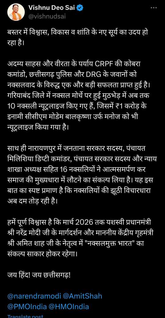 मुख्यमंत्री श्री साय ने कहा कि यह घटनाएँ इस बात का स्पष्ट प्रमाण हैं कि नक्सलियों की झूठी विचारधारा अब दम तोड़ रही है। छत्तीसगढ़ में विश्वास, विकास और शांति की नई सुबह का उदय हो रहा है। प्रधानमंत्री श्री नरेंद्र मोदी जी के मार्गदर्शन और केंद्रीय गृहमंत्री श्री अमित शाह जी के नेतृत्व में हमारा विश्वास है कि मार्च 2026 तक ‘नक्सलमुक्त भारत’ का संकल्प साकार होगा।