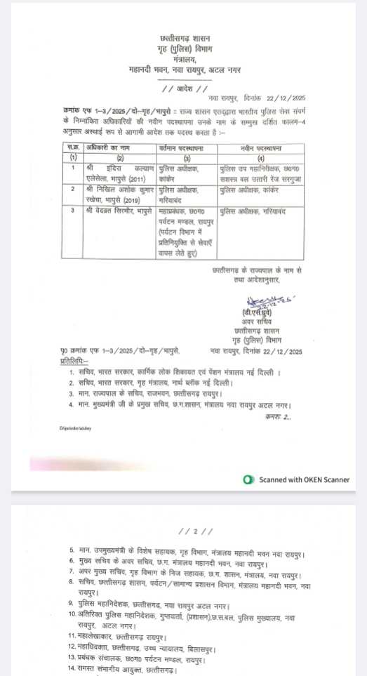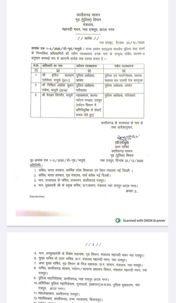 कांकेर एसपी IPS इंदिरा कल्याण एलेसेला को पुलिस उप महानिरीक्षक छग सशस्त्र बल उत्तरी रेंज सरगुजा की जिम्मेदारी दी गई है। गरियाबंद एसपी IPS निखिल अशोक कुमार रखेचा को कांकेर एसपी के पद पर पदस्थ किया गया है। वहीं आईपीएस वेदव्रत सिरमौर महाप्रबंधक छग पर्यटन मण्डल रायपुर (पर्यटन विभाग में प्रतिनियुक्ति से सेवाएं वापस लेते हुए) को गरियाबंद एसपी बनाए गए हैं।