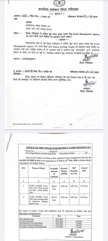 रायपुर/गरियाबंद। छत्तीसगढ़ के प्रसिद्ध धार्मिक आयोजन राजिम कुंभ कल्प 2026 को लेकर जिला प्रशासन गरियाबंद द्वारा जारी की गई टेंडर प्रक्रिया अब विवादों के घेरे में आ गई है। करोड़ों रुपये के इस भव्य आयोजन के लिए बेहद कम समय में टेंडर आमंत्रित किए जाने से पारदर्शिता पर गंभीर सवाल उठ रहे हैं।