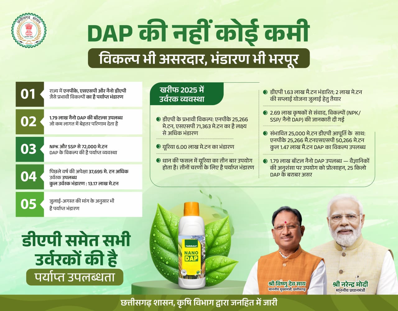 मुख्यमंत्री श्री विष्णु देव साय ने कहा है कि डीएपी खाद की कमी को लेकर किसानों को परेशान होने की जरूरत नहीं है। इसके विकल्प के रूप में छत्तीसगढ़ सरकार द्वारा अन्य रासायनिक उर्वरक जैसे- नैनो डीएपी, एनपीके और एसएसपी की भरपूर व्यवस्था सुनिश्चित की गई है। इंदिरा कृषि विश्वविद्यालय के कृषि वैज्ञानिकों और कृषि विभाग के अधिकारियों के सुझाव के अनुरूप किसान डीएपी के बदले उक्त उर्वरकों का प्रयोग कर बेहतर उत्पादन प्राप्त कर सकते हैं। सोसायटियों से किसानों को उनकी डिमांड के अनुसार खाद-बीज का पर्याप्त भंडारण किया गया है।