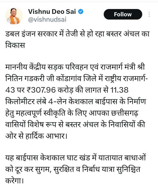 केंद्रीय सड़क परिवहन एवं राजमार्ग मंत्री नितिन गडकरी ने ट्वीट कर दी जानकारी: मुख्यमंत्री साय ने आभार प्रकट करते हुए बस्तर के विकास के लिए बताया निर्णायक कदम