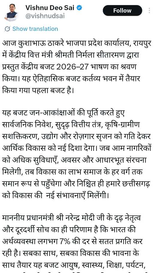 अंत में मुख्यमंत्री ने कहा कि केंद्रीय बजट 2026-27 ‘सबका साथ, सबका विकास, सबका प्रयास और सबका विश्वास’ की भावना को और मजबूत करता है। यह बजट छत्तीसगढ़ सहित पूरे देश में समावेशी विकास सुनिश्चित करेगा। उन्होंने छत्तीसगढ़ की जनता की ओर से प्रधानमंत्री श्री नरेंद्र मोदी और केंद्रीय वित्त मंत्री श्रीमती निर्मला सीतारमण को इस ऐतिहासिक, विकासशील और जनकल्याणकारी बजट के लिए हार्दिक धन्यवाद ज्ञापित किया।