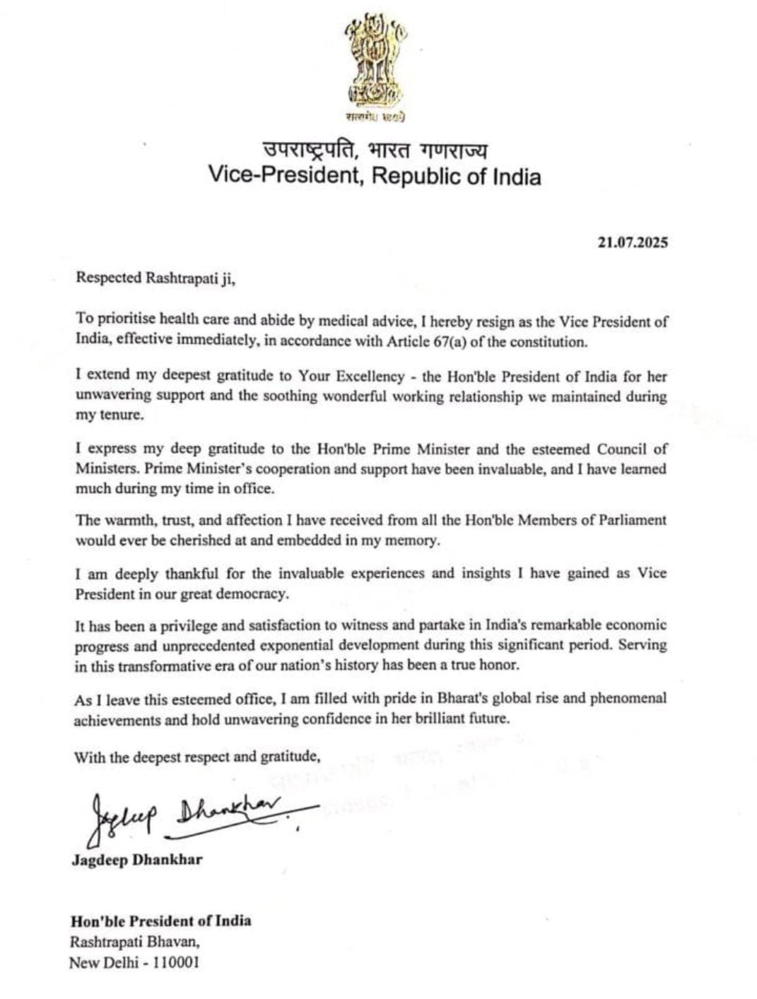 उपराष्ट्रपति जगदीप धनखड़ ने इस्तीफा दे दिया है। धनखड़ ने अपना इस्तीफा राष्ट्रपति द्रौपदी मुर्मू को सौंपा है।