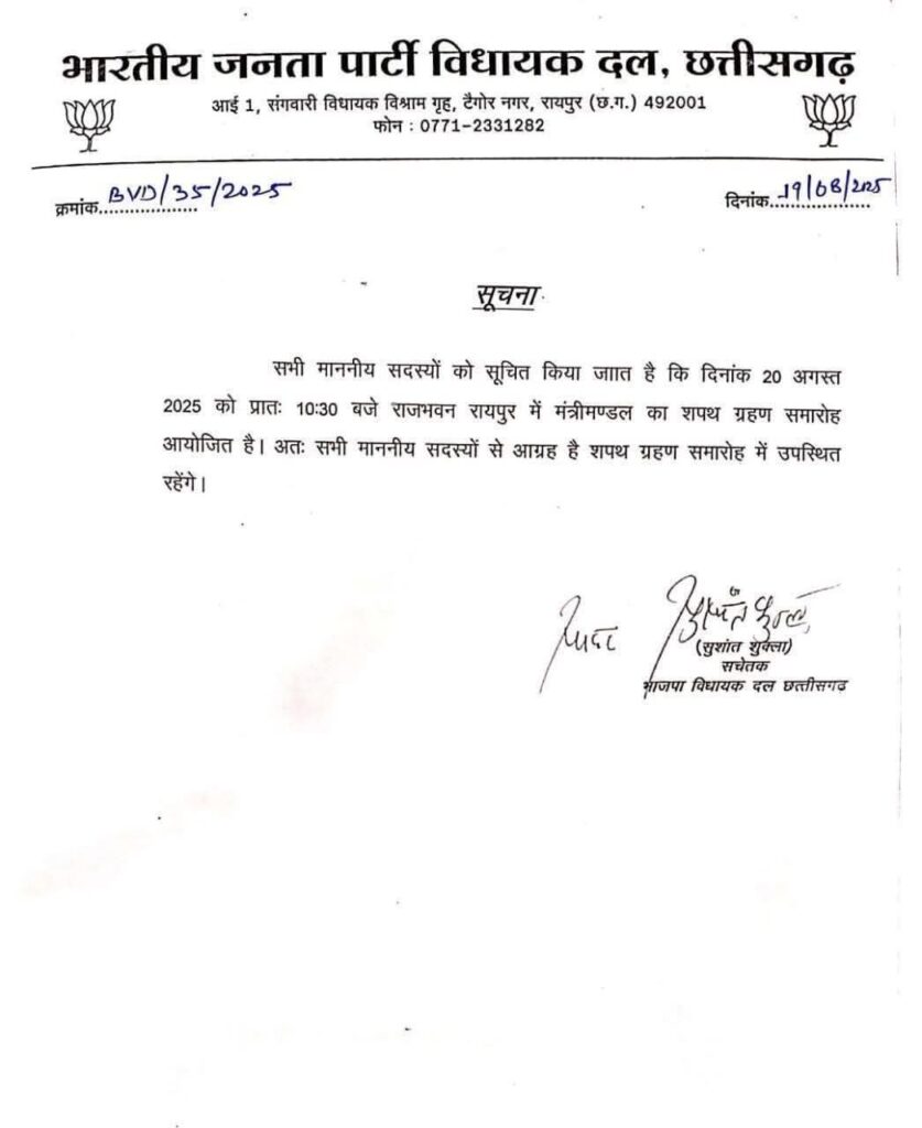 रायपुर। देर शाम भाजपा विधायक दल के सचेतक सुशांत शुक्ला ने अधिकृत रूप से मंत्रिमंडल विस्तार के संबंध में जानकारी देते हुए कल 20 अगस्त सुबह 10.30 बजे राजभवन रायपुर में सभी सदस्यों को आमंत्रण प्रेषित किया।