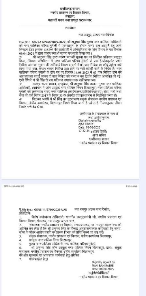 बिलासपुर। लंबे समय तक छत्तीसगढ़ में घोटालों के नाम पर असमन्वय पूर्ण वातावरण के लिए चर्चित रहा मुंगेली नगर पालिका परिषद में सीएमओ रहे अनुभव सिंह निविदा में हुए अनियमितता के चलते निलंबित किए गए।